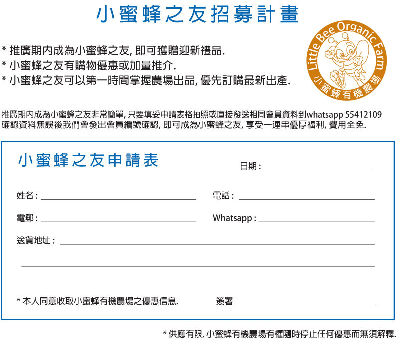 填妥以下資料用 Whatsapp 55412109 傳送給我們, 即可成為小蜜蜂之友